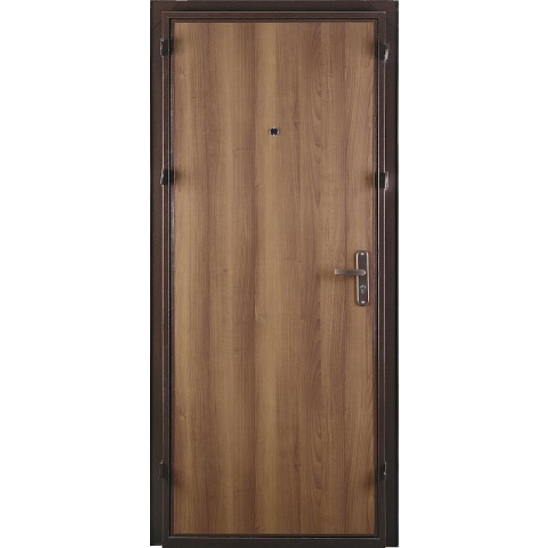 Дверь комплектуется цилиндровым замком Просам 3B4-31/55 второго класса, дверным глазком круглой формы. Дверная ручка установлена на планке совместно с замком и окрашена в медный цвет.
