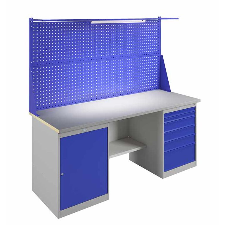 корпус серый полуматовый (RAL 7038), лицевая панель ящиков и дверцы тумбы – синий (RAL 5002)