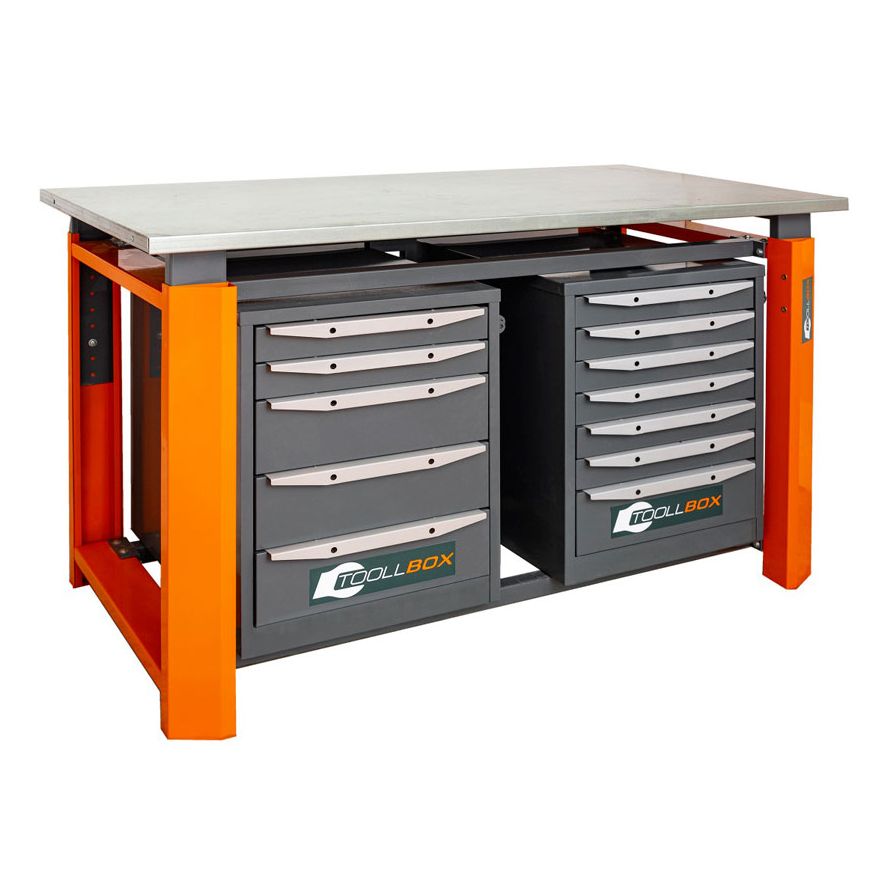 Главная особенность модели — комбинированные тумбы с разной логикой хранения. С одной стороны установлена тумба с 5 выдвижными ящиками, с другой — тумба с 7 ящиками. Такой набор помогает распределить оснастку по частоте использования: крупное и тяжелое — отдельно, расходники и измерительный инструмент — отдельно, а мелочевка не смешивается с тем, что постоянно берешь в руки. Обе тумбы оснащены петлями под навесной замок — удобно, если верстак стоит в общем цехе, на объекте или в мастерской, где к инструменту есть доступ у нескольких человек.